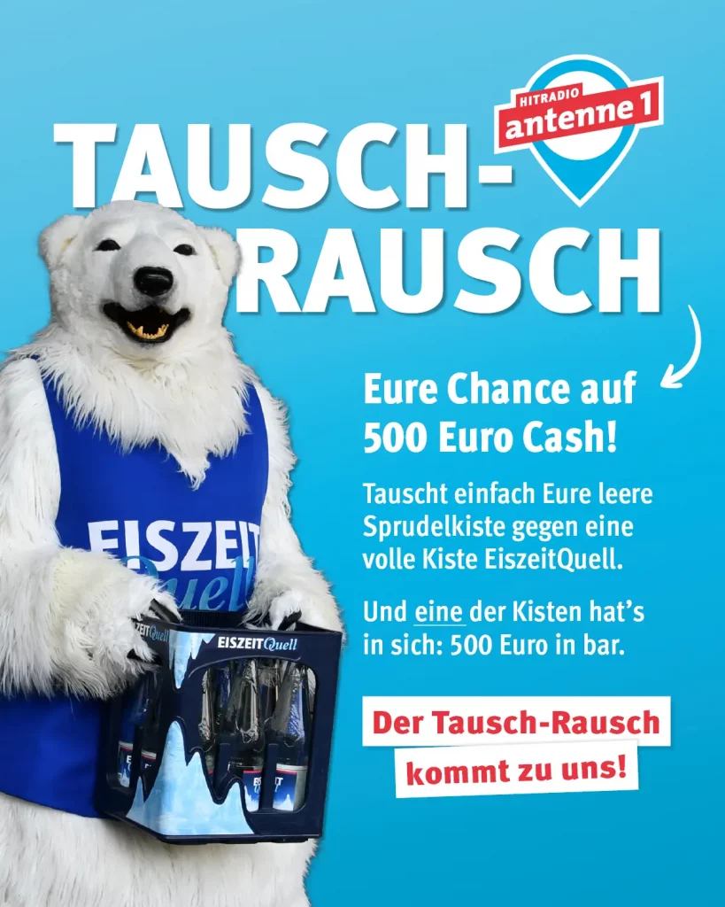 Hitradio antenne 1 und EiszeitQuell starten die größte Umtausch-Aktion aller Zeiten: Tausche deine leere Sprudelkiste gegen eine volle Kiste EiszeitQuell – und mit etwas Glück gewinnst du 500 Euro, denn in einer Kiste steckt bares Geld!